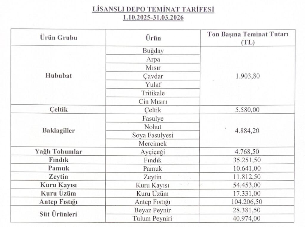 Lisanslı Depo Teminat Tarifesi